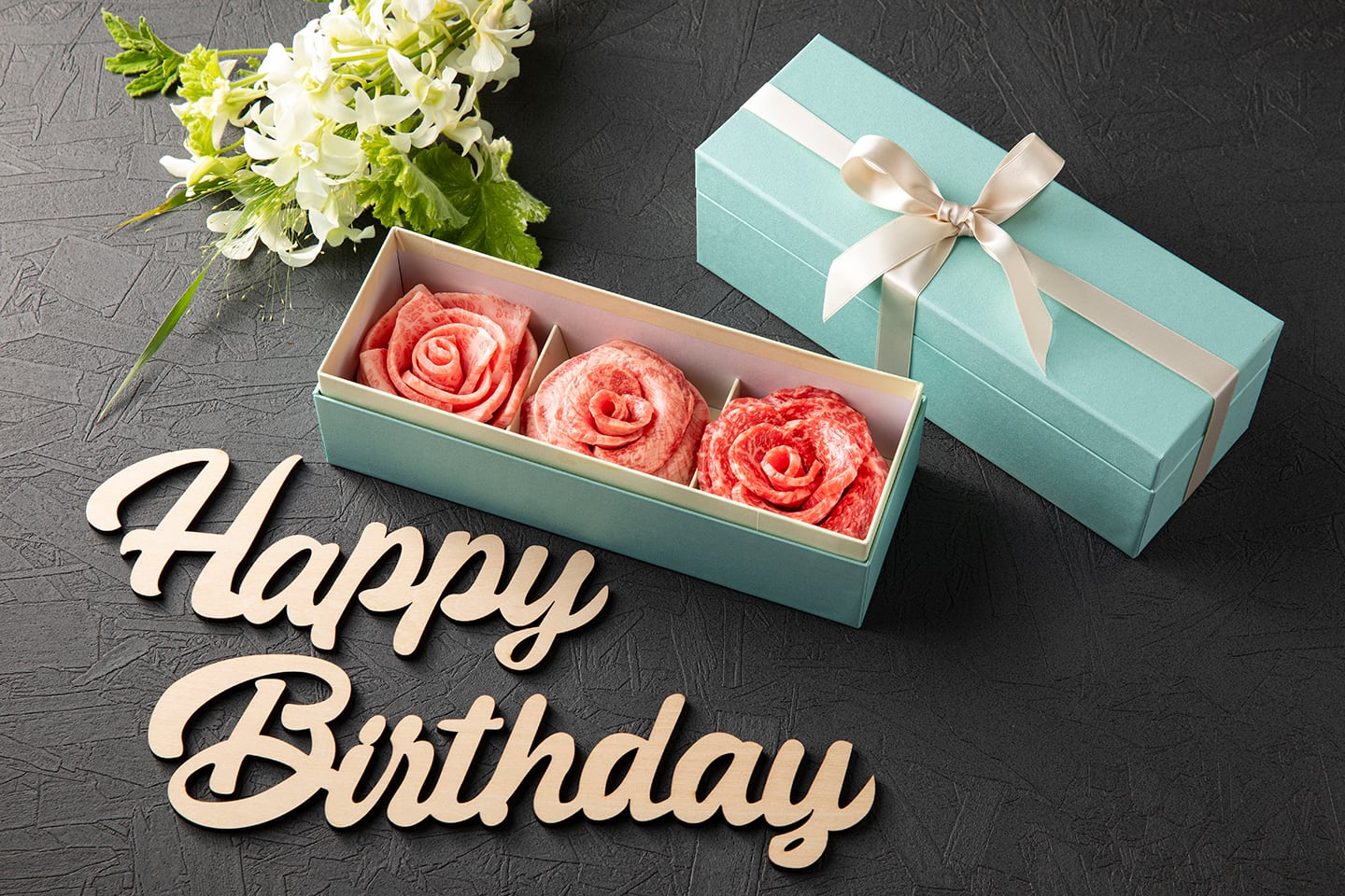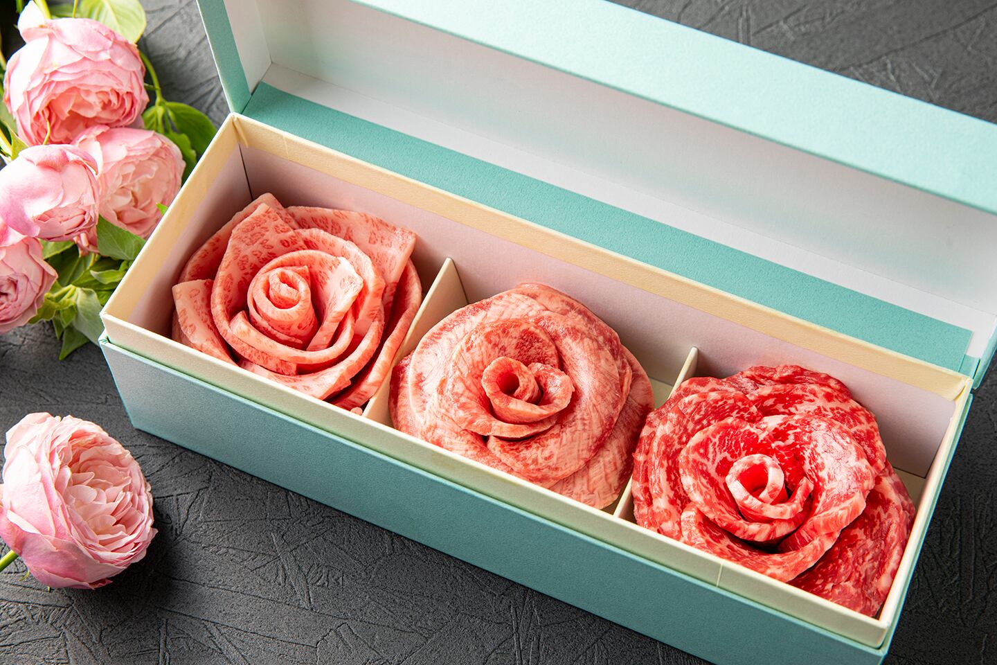 国産牛白タン(120g)、黒毛和牛バラ(120g)、黒毛和牛ランプ(120g)をそれぞれ薔薇の形に整形して3個入りのギフトBOXに入れお届けします。